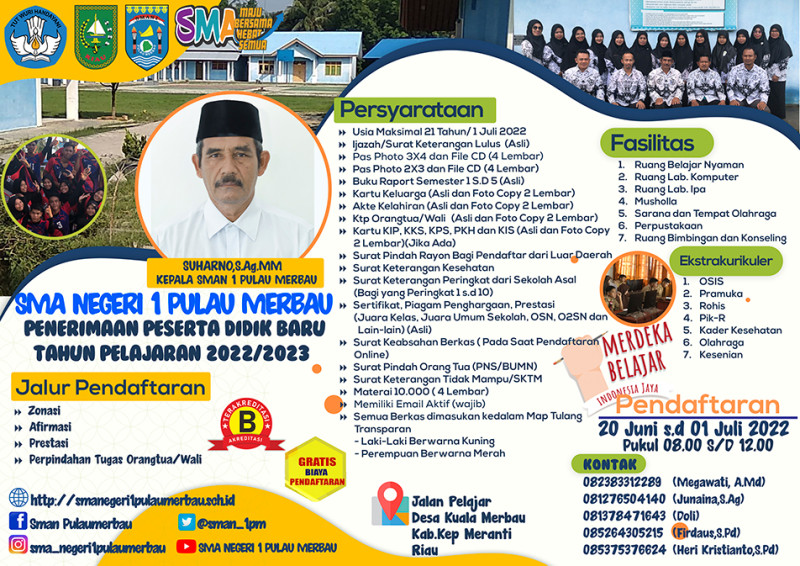 SMA Negeri 1 Pulau Merbau akan membuka pendaftaran peserta didik baru tahun ajaran 2022/2023 yang akan dimulai pada tanggal 20 juni sampai dengan 1 juli 2022, bagi adik-adik lulusan dari SMP/MTS dan Sederajat yang ingin mendaftar di SMA Negeri Pulau Merbau agar bisa melihat persyaratannya dibawah ini: